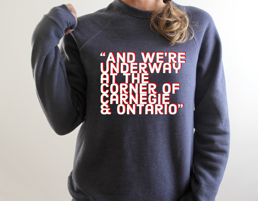 And we're underway at the corner of Carnegie & Ontario printed a super soft heather navy unisex pullover sweatshirt. We can all agree that Tom Hamilton says it the best!