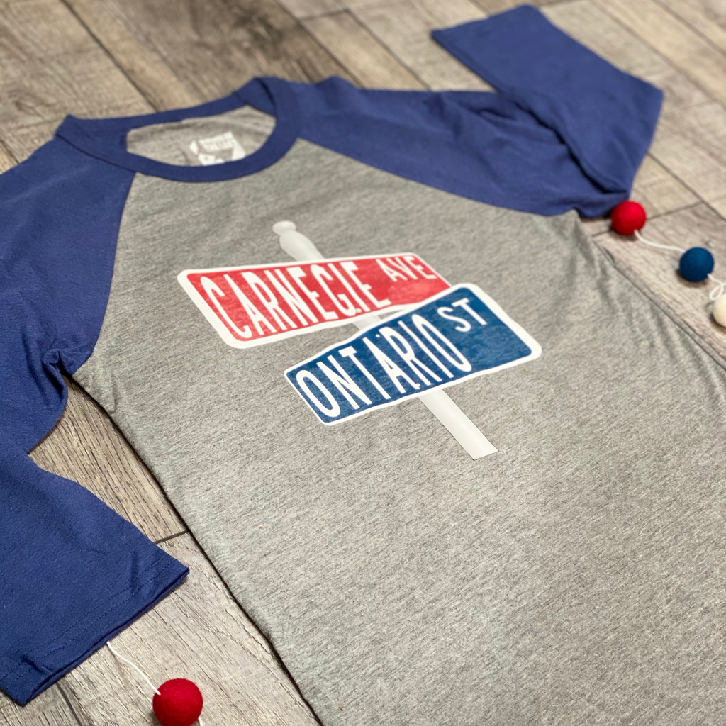 We're underway at the corner of Carnegie & Ontario! This 3/4 raglan baseball tee features the beloved crossing road signs of Carnegie & Ontario.