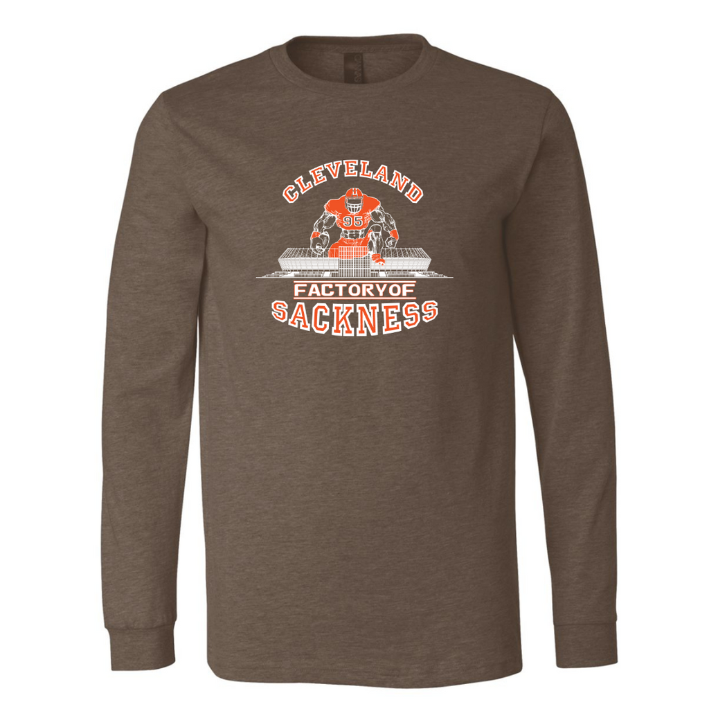 Embrace your love for Cleveland football with our Factory of Sackness long sleeve tee. Designed for both men and women, this shirt offers a perfect fit and is made from a soft blend for ultimate comfort. You won't find a softer, higher quality tee anywhere else! Machine wash cold and dry on low for long-lasting wear.