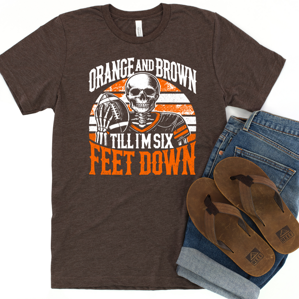 Display your love for Cleveland in our Orange & Brown til I'm 6 feet down unisex t-shirt.