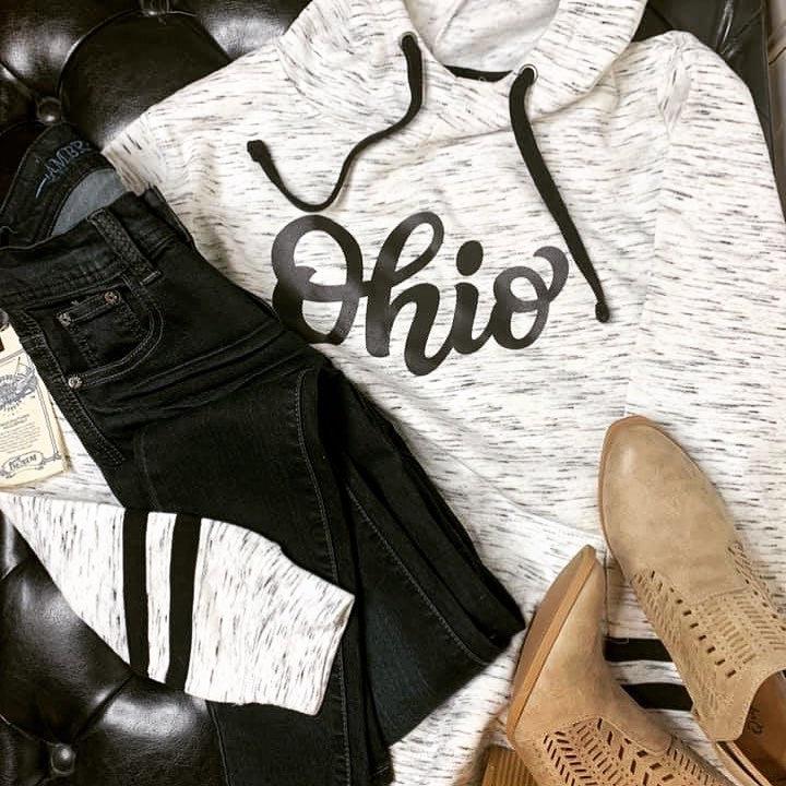 Celebrate The Buckeye State of Ohio with this script Ohio melange fleece scuba hoodie.  These are a women's cut
