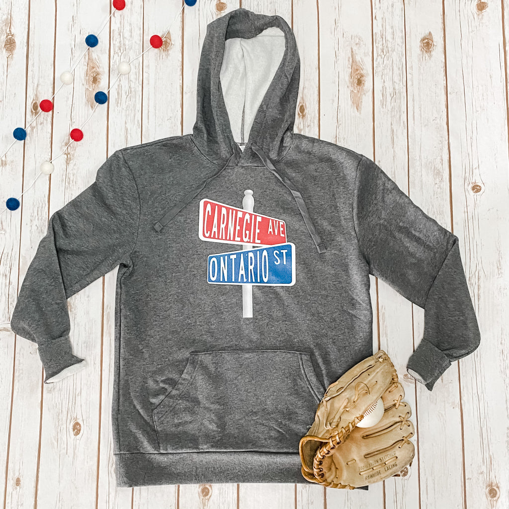 We're underway at the corner of Carnegie & Ontario! This hoodie features the beloved crossing road signs of Carnegie & Ontario.
