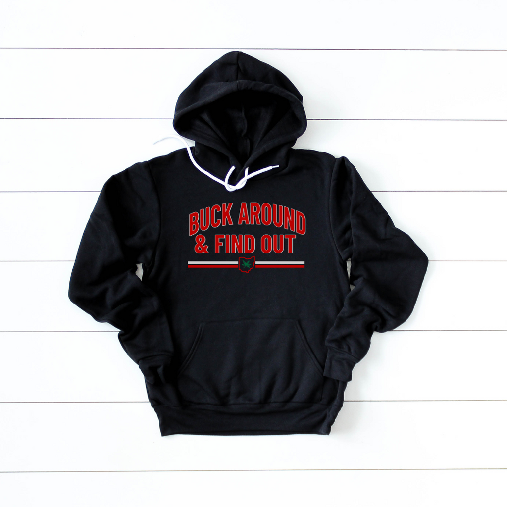 Show off your love for Ohio in our Buck Around and Find Out hoodie. Featuring kangaroo pocket.