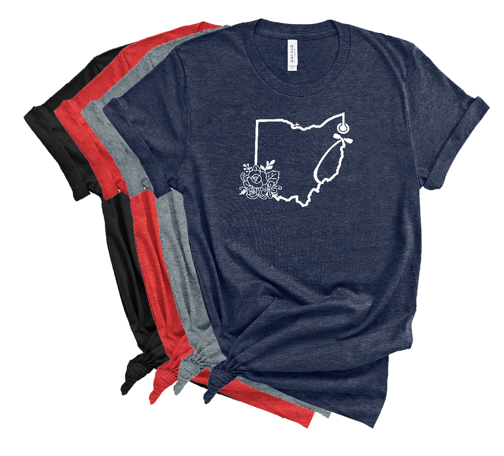 Our Ohio nurse tee is essential for any Ohio nurse. Featuring the state of ohio, stethoscope & flowers on a trebled tee. The fabric is so soft, you'll never want to take it off.