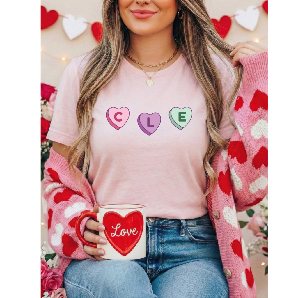 Celebrate your Cleveland pride with our charming CLE Candy Hearts apparel. Perfect for locals and visitors alike, this tee combines playful nostalgia with genuine hometown spirit. Whether you're cheering at the game or grabbing coffee around the city, wear your love for CLE with style and personality.